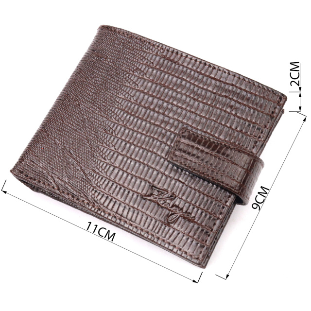 Небольшой мужской кошелек из натуральной кожи с тиснением под рептилию, в коричневом цвете. Изделие закрывается на хлястик с кнопкой . На лицевой стороне в виде декора расположен логотип производителя. Аксессуар упакован в фирменную коробочку. Изделия из натуральной кожи всегда будут отличным подарком для близкого человека.
