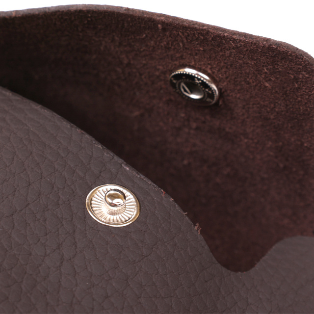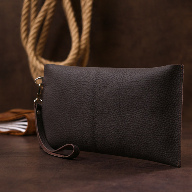 Красивая и практичная тревел-косметичка из натуральной высококачественной кожи с высокими показателями устойчивости к износу. Изделие выполнено в крупнозернистой фактуре, имеет темный коричневый цвет и матовую поверхность, что смотрится очень стильно. Закрывается аксессуар на клапан с двумя кнопками, также есть съёмный кожаный ремешок на запястье.