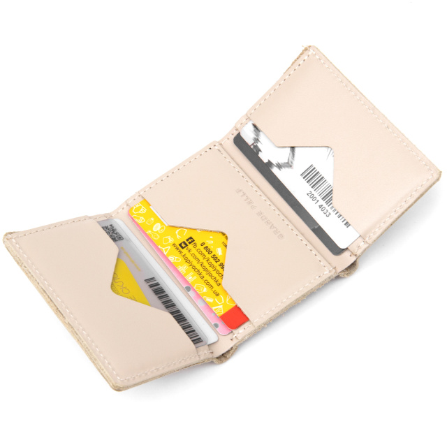 Небольшое, но оригинальное портмоне из натуральной кожи, которое подойдет как для женщин, так и для мужчин. Благодаря своим размерам легко поместится в сумке или кармане. Имеет красивый бежевый цвет с молочным оттенком, кожа гладкая и приятная на ощупь. Упаковка представлена в виде фирменного чехла.