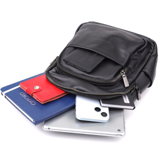 На лицевой стороне находятся накладной карман на молнии и дополнительный открытый карман — практичные решения для хранения предметов первой необходимости. По бокам расположены два открытых кармана, а на тыльной стороне — ещё один карман на молнии.