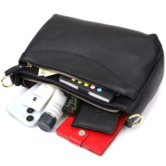 Эта чёрная кожаная сумка с формоустойчивым дном — идеальный выбор для женщин, которые ценят стиль, качество и функциональность в одном аксессуаре.
