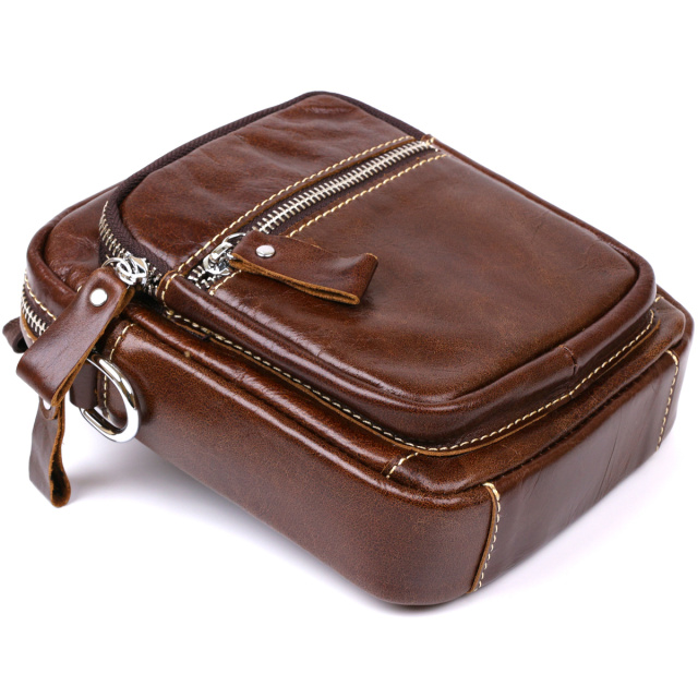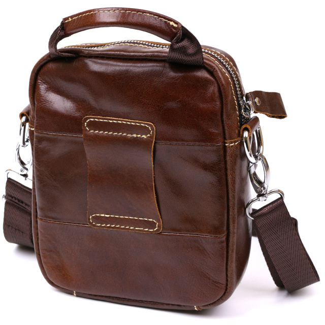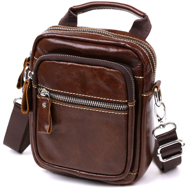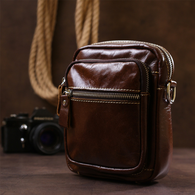 Небольшая мужская сумка из гладкой натуральной кожи высокого качества. Имеет вместительное основное отделение со стандартным карманом для телефона и маленьким карманом на молнии, также на внешней стороне есть дополнительные карманы. Ремень выполнен из высокопрочного текстиля и регулируется по длине. Данную модель можно также носить на поясе, для этого предусмотрено специальное крепление.