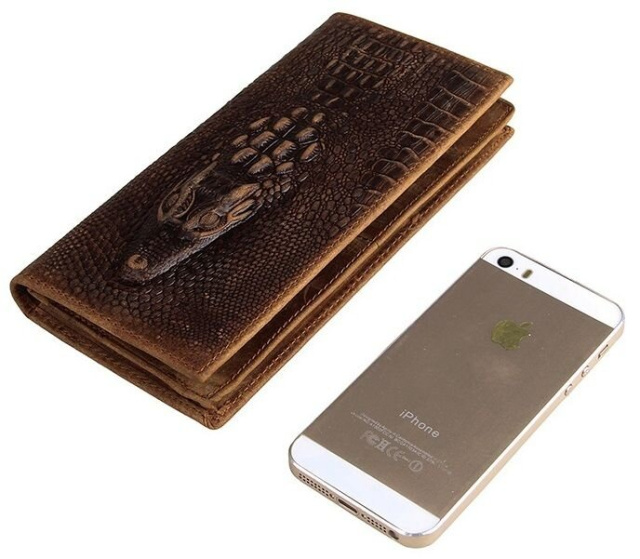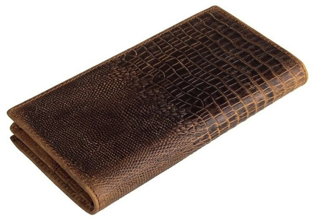 Вертикальный мужской бумажник из кожи с фактурой под крокодила. В такой кошелек любая купюра помещается в развернутом состоянии. Аксессуар прошит сверхпрочной нитью светло-коричневого цвета. Данная модель поставляется в текстильном пылезащитном чехле.