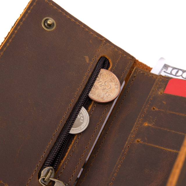 Тонкое компактное матовое портомне из натуральной кожи с двумя кнопками. Изделие имеет коричневый насыщенный цвет и выполнено в винтажной коже. В процессе эксплуатации на поверхности винтажной кожи появляются потертости и царапины, которые создают эффект старины. Портмоне поместится в маленькую сумку или карман брюк. Кошелек станет прекрасным подарком для ваших близких. Портмоне имеет весь самый необходимый функционал. Кошелек очень приятный на ощупь. Подойдет для тех, кто не любит больших аксессуаров.