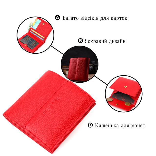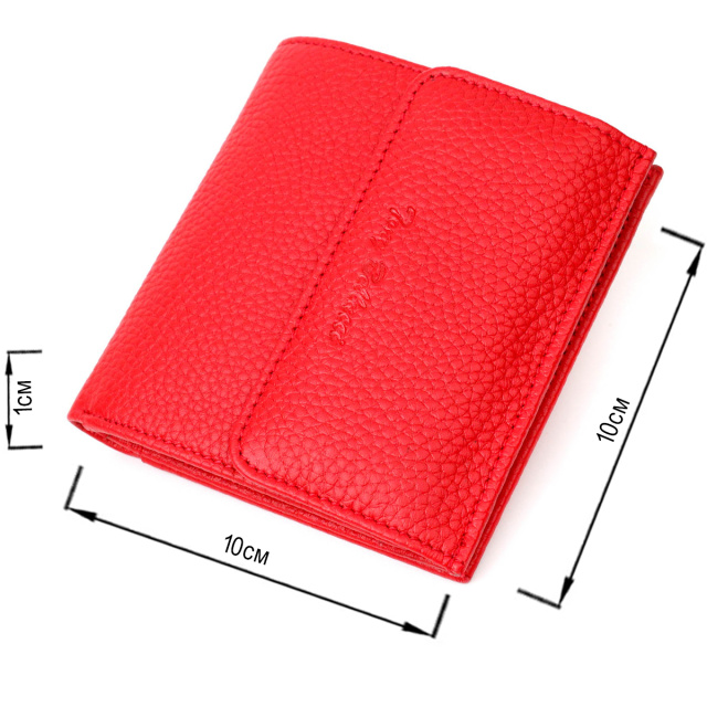 Небольшой красный женский кошелек из натуральной кожи. Аксессуар состоит из двух широких отделений для купюр, трех ячеек для пластиковых карт, трех прилегающих карманов, кармана под сеточкой и монетницы под клапаном снаружи. В изделии использована качественная фурнитура золотистого цвета. Закрывается кошелек на кнопку. Отличный кожаный кошелек который прослужит не один год.