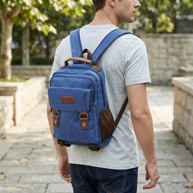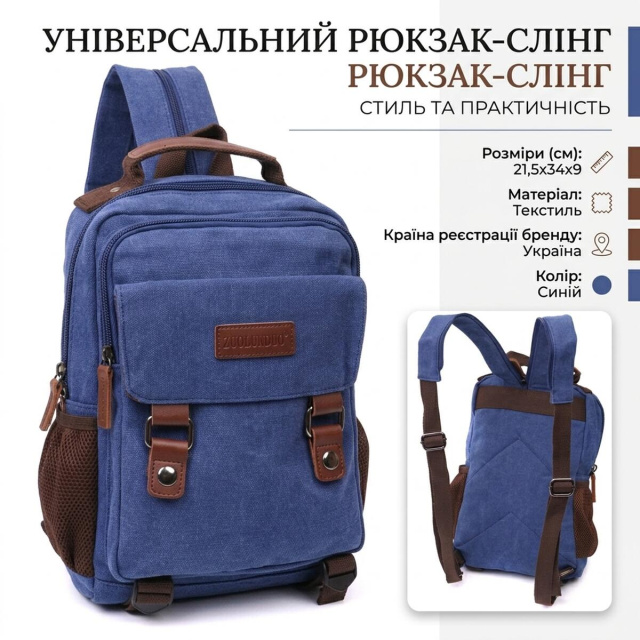 Изделие выполнено из прочного текстиля синего цвета. Материал легко стирается, неприхотлив в уходе и хорошо подходит для активного ежедневного использования. Подкладка из темно-коричневой ткани делает модель более практичной, а городской стиль позволяет легко сочетать рюкзак с повседневной одеждой.