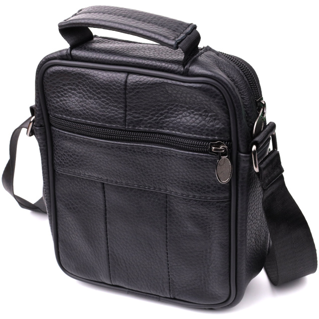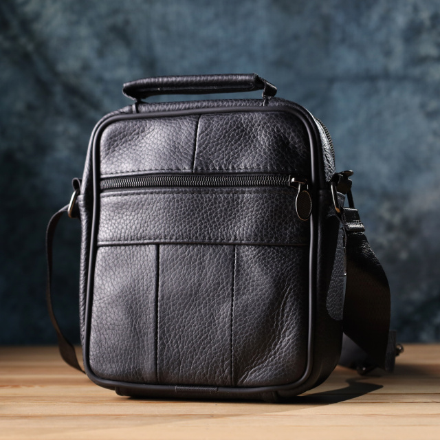 Компактная мужская сумка из высококачественной натуральной кожи, которая устойчива к различным повреждениям и износу. Имеет одно основное отделения и четыре дополнительных кармана для различных аксессуаров. Ремень выполнен из прочного текстиля и регулируется по длине. Классический чёрный цвет дополняет практичность модели и делает её отличным выбором на каждый день.