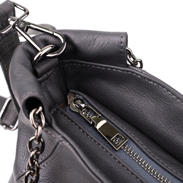 Для комфорта в носке предусмотрен съёмный кожаный ремешок длиной 118 см, который можно регулировать по длине, выбирая оптимальный вариант ношения — на плече или через плечо. Фурнитура выполнена в цвете серебра, что гармонично дополняет сдержанный серый тон кожи и придаёт сумке современный и стильный вид.