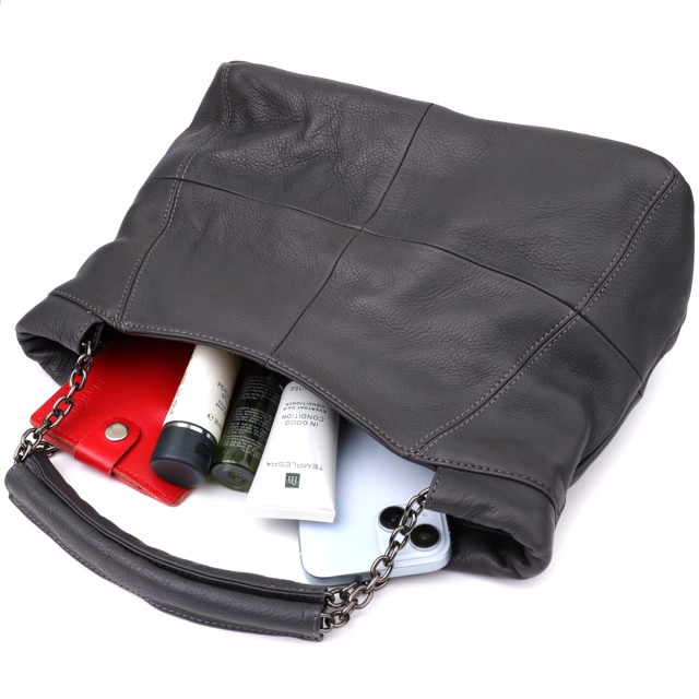Женская кожаная сумка серого цвета — сочетание элегантности и практичности. Изготовленная из натуральной кожи высокого качества, эта сумка отличается благородным серым оттенком, который легко вписывается в любой гардероб и подходит для самых разных образов — от делового до повседневного. Компактные размеры делают модель удобной и функциональной, позволяя носить все необходимые вещи под рукой.