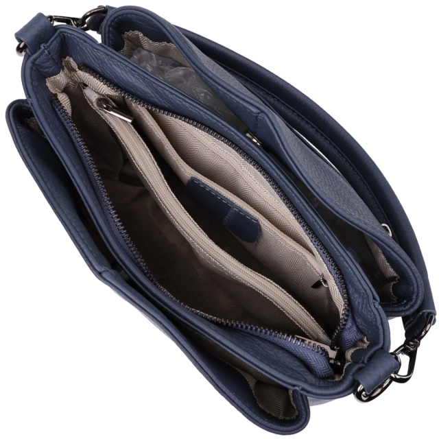Сумка оснащена одним основным отделением, которое закрывается на молнию. Внутри предусмотрено четыре кармана: два на молниях для надежного хранения документов, телефона или кошелька, и два открытого типа для мелочей, к которым нужен быстрый доступ.