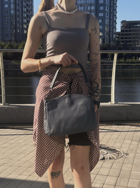 Фурнитура цвета серебра придает модели аккуратный и современный вид, подчеркивая ее сдержанный стиль. Сумка комплектуется съемным кожаным ремешком, который позволяет носить ее на плече или в руках.