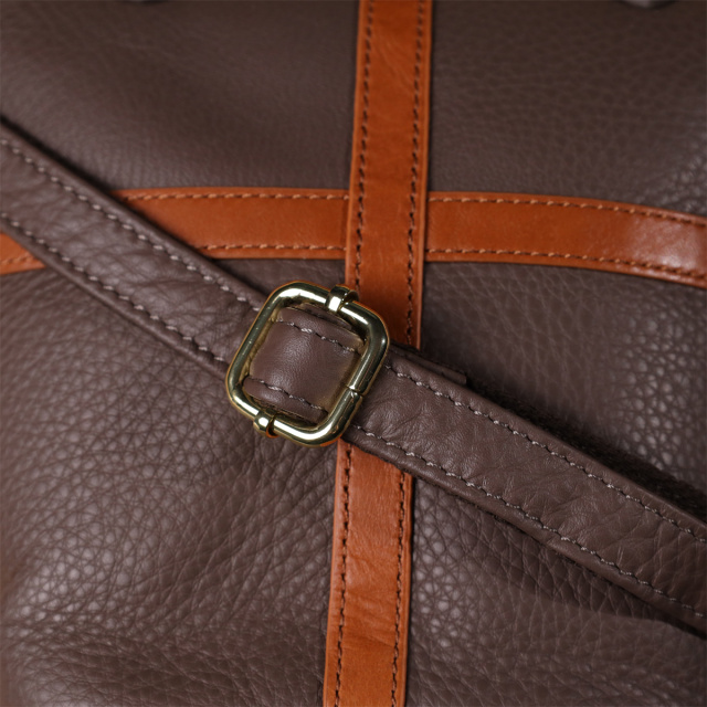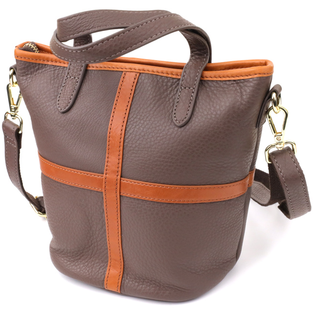 Твёрдое дно помогает сумке сохранять форму и придаёт ей устойчивость. Фурнитура цвета жёлтого золота эффектно контрастирует с благородным бежевым оттенком кожи, добавляя аксессуару утончённости.