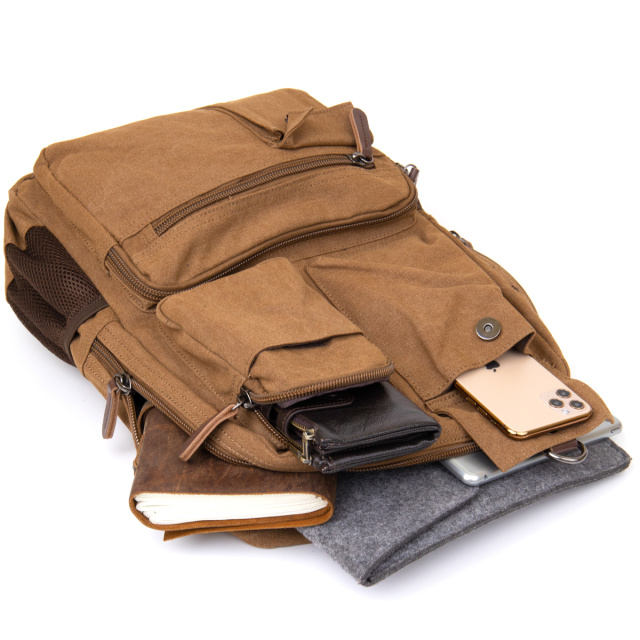 Великий рюкзак для ноутбука і подорожей. Виріб має досить кишеньок як на лицьовій стороні так і всередині. У поєднанні з якісною фурнітурою рюкзак прослужить вам далеко не один рік. Виріб дуже практичного кольору на якому практично не видно бруду. Усередині тканинна підкладка. Рюкзак стане відмінним варіантом як для ноутбука так і в подорож. Виріб має відносно легку вагу. Текстильний рюкзак - найкращий варіант у співвідношенні ціни і якості.