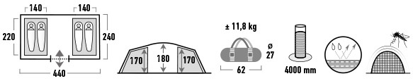 High Peak Tauris 4 Dark Grey/Green (11560) - чотиримісний тунельний намет із дзеркально розташованими роздільними спальнями. Два протилежні входи забезпечують зручний доступ усередину. Завдяки опорним вертикальним стійкам, фронтальні двері можуть бути використані як навіс від сонця. Переднє вікно в житловій зоні виконане з прозорого ПВХ і призначене для доступу світла, а заднє з москітної сітки - для додаткової вентиляції. Знімна підлога в тамбурі захищає від вогкості, а одну зі спалень можна не встановлювати, щоб збільшити внутрішній простір. Двері внутрішніх наметів виконані з москітної сітки для кращої вентиляції та захисту від комах. High Peak Tauris 4 Dark Grey/Green (11560) - ідеальний намет для відпочинку в кемпінговому таборі з сім'єю чи друзями.