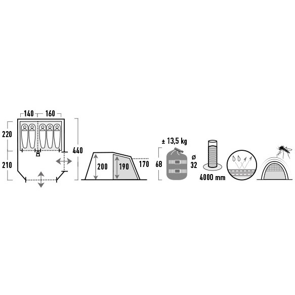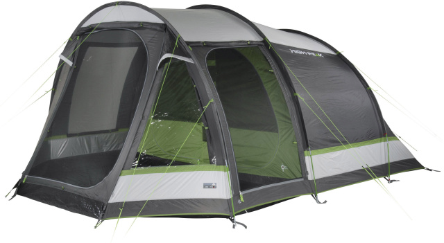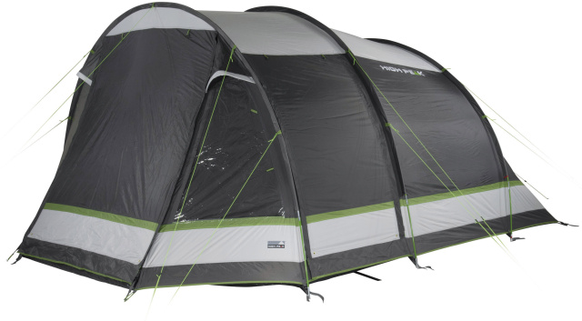 High Peak Meran 5.0 Light Grey/Dark Grey/Green (11808) - пʼятимісний сімейний тунельний намет із двома входами та вітальнею зі вшитою підлогою, що забезпечує захист від настирливих комах та небажаних протягів. Житлова зона з висотою стелі 2 м має достатньо місця для розміщення кемпінгових стільців, столу та похідного спорядження. Дві сітчасті двері збільшують приплив свіжого повітря та захищають від комах. Прозорі вікна в житловій зоні наповнять приміщення світлом, а штори за необхідності забезпечать усамітнення. Дах має тепловідбивне алюмінізоване покриття, що знижує підвищення температури всередині намету вдень у сонячну погоду.