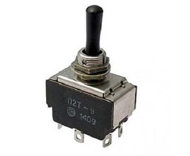 Тумблер П2Т-9 является двухполюсным трехпозиционным переключателем. Его электрическая схема обычно соответствует функции ON-OFF-ON. В одном крайнем положении замыкается одна группа контактов (на каждом полюсе), в среднем положении (OFF) обе группы контактов разомкнуты, а в другом крайнем положении замыкается другая группа контактов.